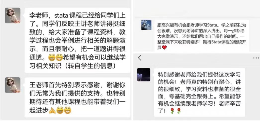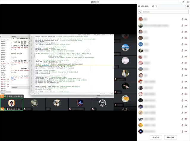 授课过程中,高逸尘老师由浅入深地介绍了STATA软件的基本情况和在数据分析方面的应用,从软件调试、简单统计计算、数据导入、数据清洗、基础回归等多方面为大家介绍了软件基本操作语句的使用方法,为同学们自主深入学习奠定了基础。课程过后,高逸尘老师将课程中涉及的数据和代码发布至答疑群,以便学生们复习巩固。